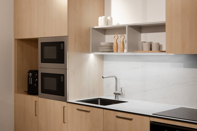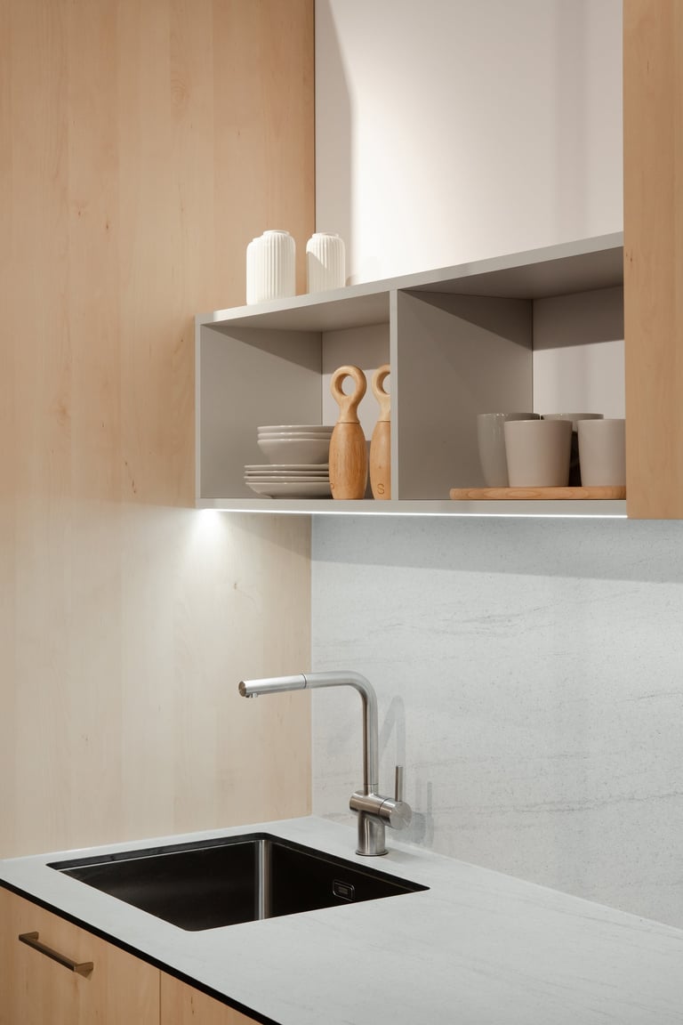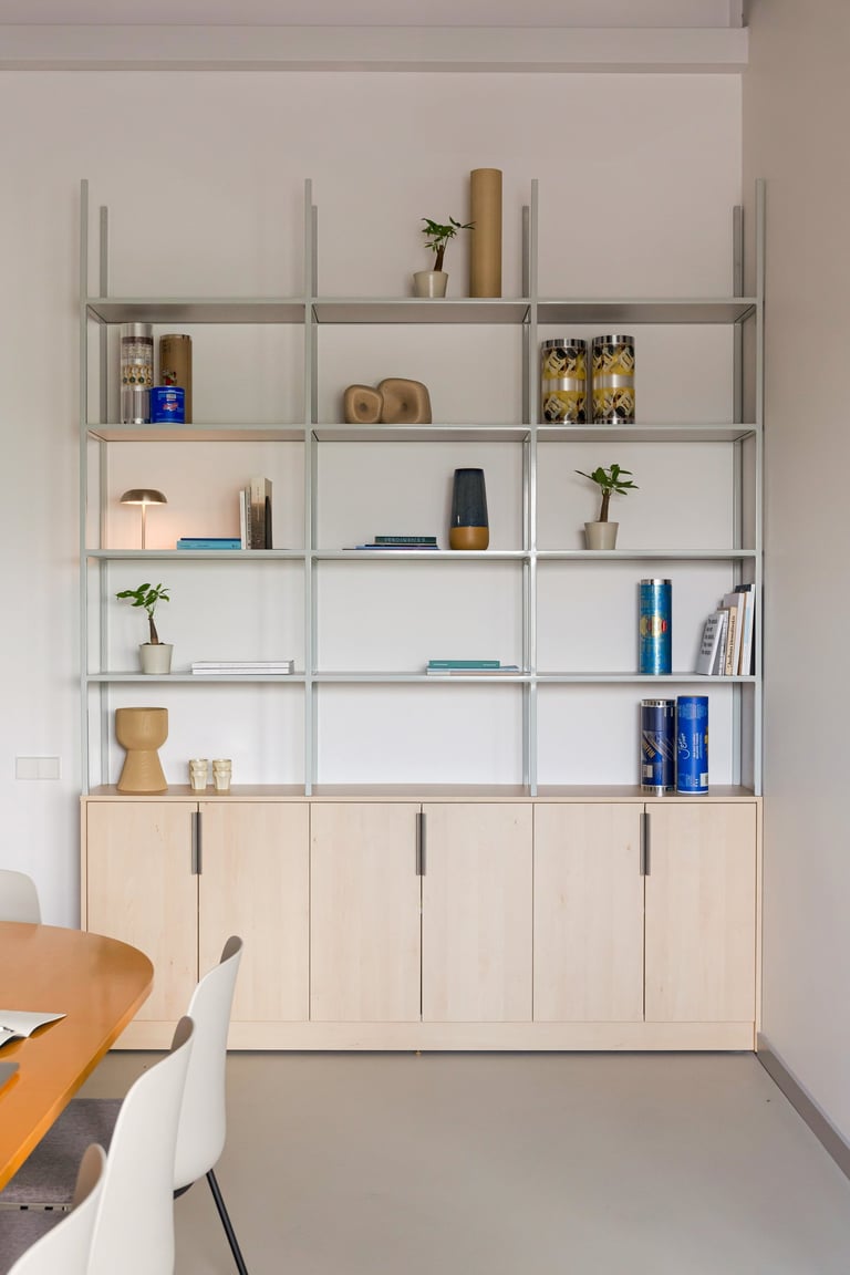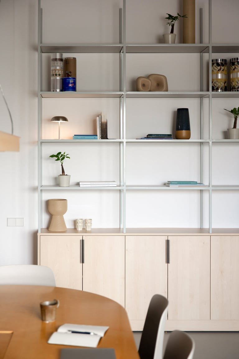 – „juokingąsias“ kolonas, tarpe jų įrengiant lentynėlės ir stalčių sistemas. Šis sprendimas suteikia erdvei žaismingumo, o